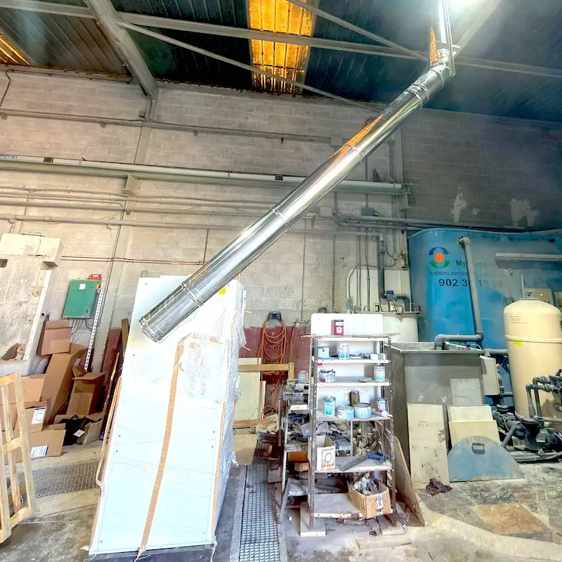 Hemos preparado la salida de humos hasta cubierta usando tubería inoxidable de doble pared. Esta solución ofrece mayor seguridad, resistencia y un correcto aislamiento térmico. Y por supuesto, cumple con la normativa vigente para este tipo de instalaciones en espacios industriales.