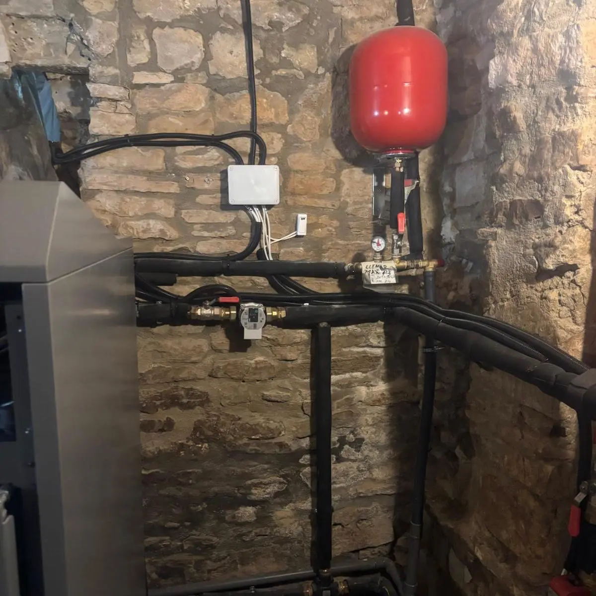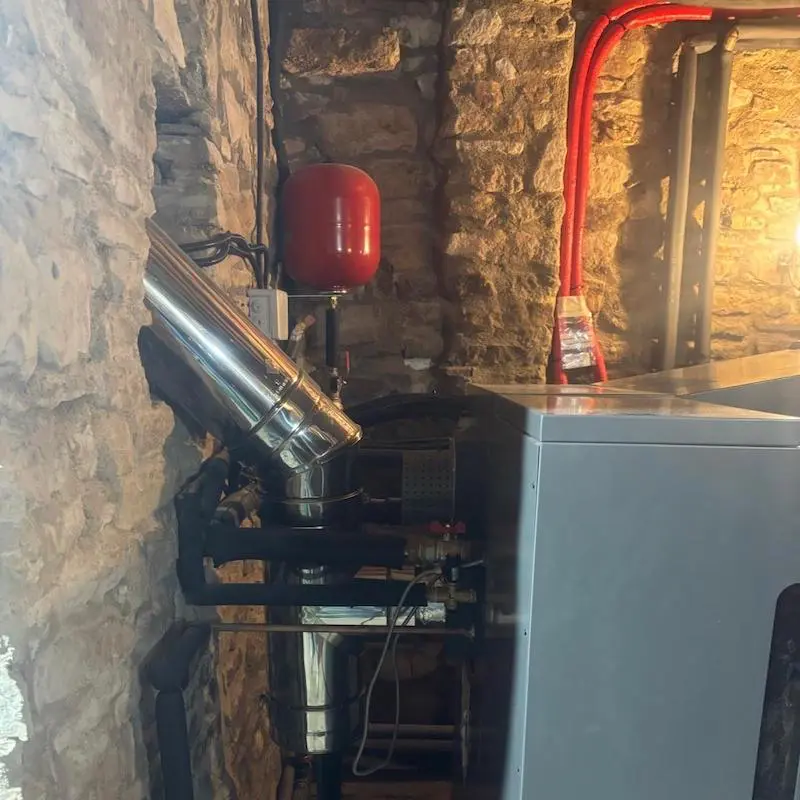 Instalación de caldera mixta de pellets y leña en una casa de pueblo de Álava. Se ha instalado el conjunto Domusa, Dual Therm